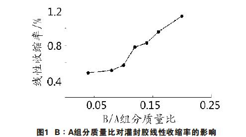 2結果與討論 2.1線性收縮率 考查A、B組分質量比對灌封膠線性收縮率的影響,結果見圖1。