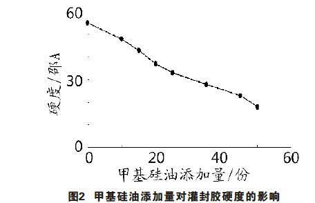 在其他組分不變的前提下,考查了甲基硅油添加量對灌封膠硬度和膠料混合后黏度的影響,結果見圖2、圖3。