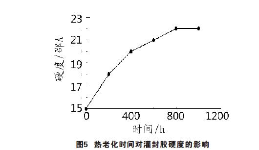 2.4耐熱性能的研究 將LED燈珠封裝好后,燈珠發光會散發出大量的熱量。為此設計了150℃熱烘烤試驗,模擬LED灌封膠在實際應用中的耐熱性能。 圖5是150C熱老化時間對封裝膠硬度的影響。