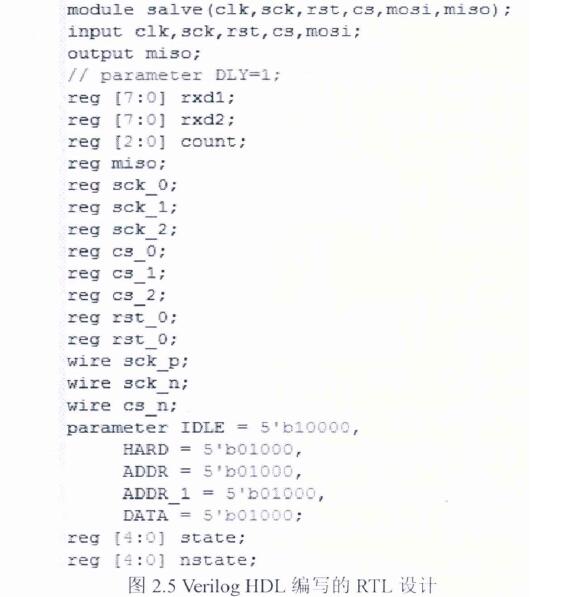 數字前端設計需要借助特定的EDA工具。早期的硬件IC系統通常采用原理圖輸入的方法進行設計,雖然這種方法直觀、可控性好,并且效率也較高,但設計復雜,可移植性差,在大規模設計時耗時耗力。隨著芯片邏輯規模的不斷攀升和計算機技術的發展,這種落后的設計方式越來越顯得力不從心,取而代之的是計算機代碼輸入的方式,即硬件描述語言HDL (Hardware Description Language)逐漸成為主流設計硬件IC系統的方法。 本文RTL設計采用的就是Verilog HDL語言,如圖2.5所示,為SPI接口協議的部分Verilog 硬件描述語言。