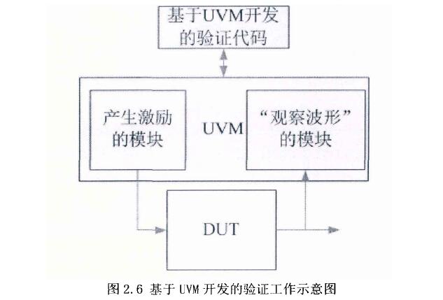 目前芯片的驗證環境主要為UVM,全稱為通用驗證方法論,其前身是OVM.UVM是通用的驗證平臺,基于它能夠產生大量、復雜且可定制化的隨機激勵,可顯著提高大型驗證工程的擴展性和協作性。舉例說明,UVM框架如軟件開發過程中的分層結構,只要定義好統一的接口,工程中的各個層次就可以分配給不同的研發團隊進行開發。驗證的項目同樣如此,即使產生激勵的工程有改動,也不會影響到“觀察波形”的團隊。而UVM在驗證工作中如同一個管家,可以將“輸入激勵”和“觀察波形”的過程統一管理了起來。如圖2.6所示,為基于UVM開發的驗證示意圖,其中DUT為待驗證模塊,產生激勵模塊即編寫的TestBench。 激勵信號傳入DUT中,輸出需要觀察的波形或者結果,通過與預期的結果比較的過程,來判斷編寫的RTL代碼是否正確。