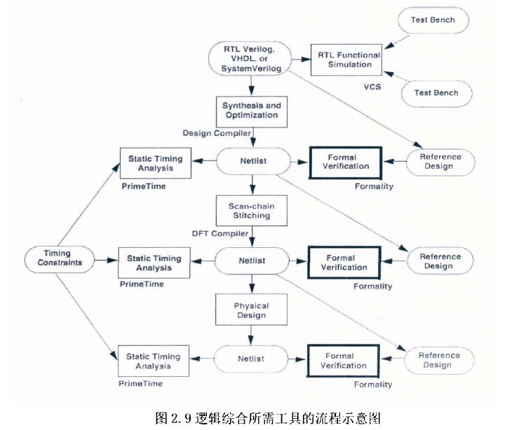 為此,綜合過程需要多種工具來保障對時序的要求。比如可測試性設計(DFT)、形式驗證(Formal Verification)、靜態時序分析( Static Timing Analysis,STA)、功能仿真( Functional Simulation)等。如圖2.9所示,為綜合所需工具的流程示意圖。